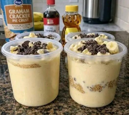 Prendi 4 contenitori trasparenti (come quelli in foto). Inizia con un fondo di granella di mandorle per la parte “crunchy”. Versa un primo strato generoso di crema alla vaniglia e banana. Aggiungi una manciata di gocce di cioccolato nel mezzo. Copri con un altro strato di crema fino all’orlo.