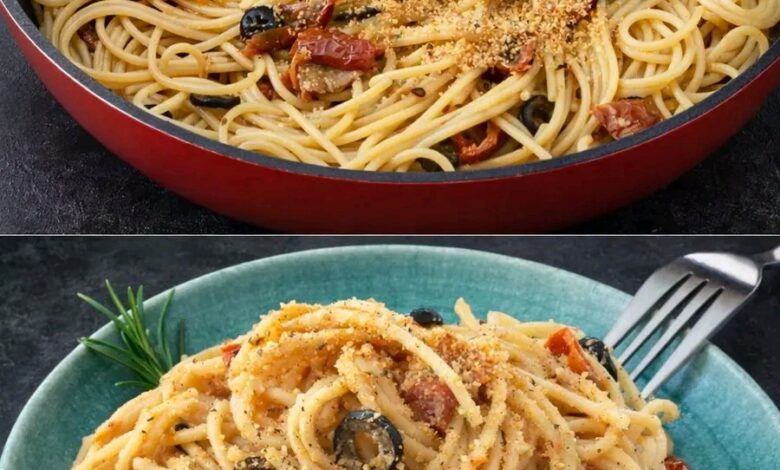 Dimentica le salse elaborate: qui la protagonista è la “muddica atturrata” (il pangrattato tostato), la povera ma nobilissima alternativa al parmigiano dei tempi antichi. Insieme alla sapidità delle olive, alla dolcezza dei pomodori secchi e all’aroma dell’aglio, questi spaghetti creano un’armonia di sapori e consistenze che ti farà chiedere il bis! 😋