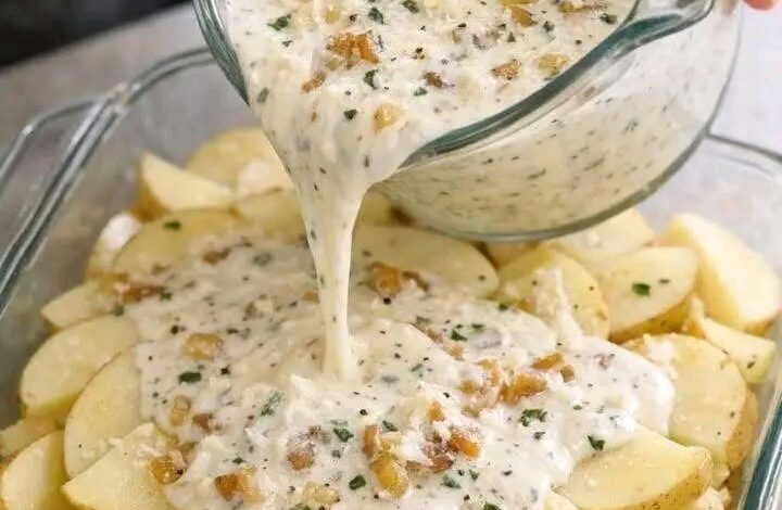 Ecco il momento magico. Prendi la tua brocca e versa la crema sopra le patate partendo dal centro e muovendoti verso i bordi. Guarda come la salsa avvolge ogni singolo spicchio, infilandosi negli angoli e promettendo una gratinatura da urlo. Prepara il telefono: questo Γ¨ il momento perfetto per un Reel al rallentatore! π½οΈβ¨