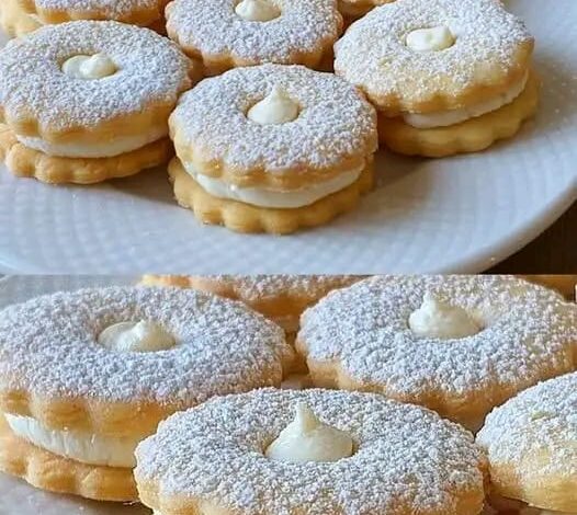Spolvera abbondantemente di zucchero a velo solo i dischetti forati (quelli che staranno sopra). Ora prendi i dischetti interi, farciscili con un bel ciuffo generoso di crema e chiudi delicatamente con il “coperchio” zuccherato. La pressione farà uscire la crema dal foro centrale, creando quel punto luce irresistibile.