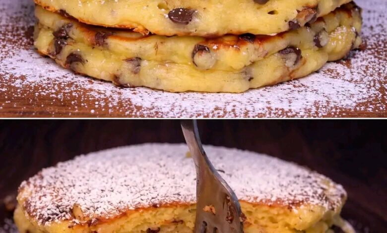 Immagina di svegliarti, sentire il profumo della pastella che cuoce e vedere queste nuvole dorate che lievitano in padella sotto i tuoi occhi. Il momento in cui affondi la forchetta e trovi una cascata di gocce di cioccolato fondente ancora calde… beh, è pura magia. Sono così buoni che, fidati, finirai per mangiarli direttamente dalla padella prima ancora di riuscire a impilarli nel piatto! ✨