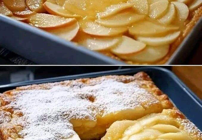Rivesti una teglia rettangolare con carta forno. Versa il composto e livellalo bene. Se vuoi un effetto estetico WOW, tieni da parte qualche fettina per decorare la superficie in modo ordinato. Inforna a 180°C per circa 40-50 minuti. La torta deve diventare dorata sopra e restare morbidissima al cuore.