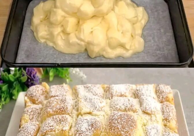 Prepara una teglia quadrata (circa 22×22 cm) con carta forno. Versa l’impasto e livellalo bene. Ora, il tocco da maestro: metti la crema pasticcera in una sac-à-poche e disegna delle linee orizzontali e verticali sopra l’impasto. Durante la cottura, l’impasto lieviterà intorno alla crema, creando quell’effetto a “cuscinetto” super scenografico che vedi in foto. 🎨