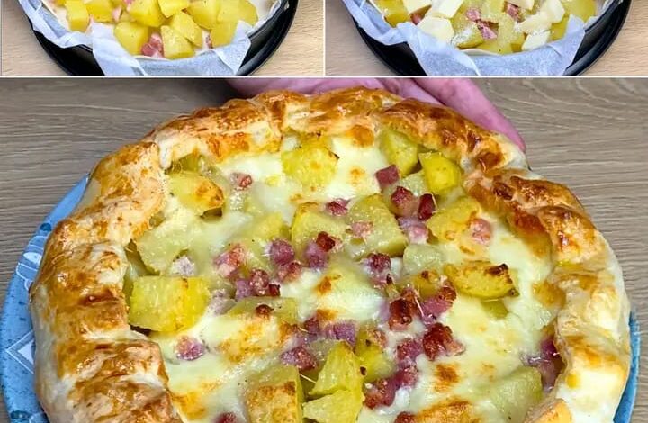 Assemblaggio: Stendi la pasta sfoglia in una teglia con la sua carta forno. Bucherella il fondo con una forchetta. Disponi uno strato di scamorza sul fondo, poi versa il composto di patate e speck.