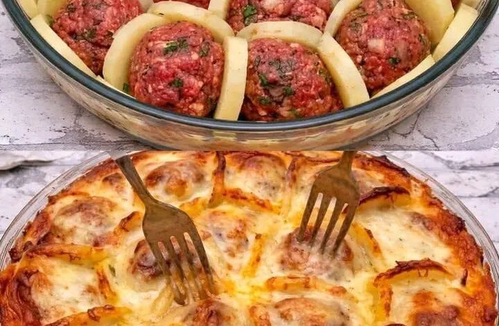 Lessate le patate e tagliatele a fette. Guarnite con polpette e formaggio e infornate per una deliziosa delizia francese… 👇👇