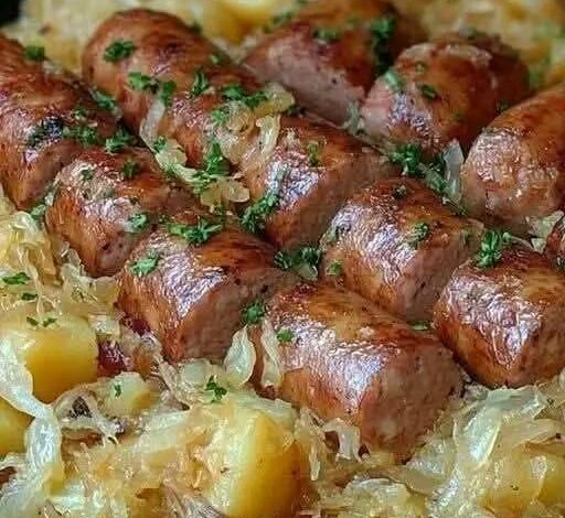 Hai presente quel profumo che ti accoglie quando entri in casa e capisci subito che la cena sarà leggendaria? Ecco, stiamo parlando di questo. Non è solo un piatto, è un abbraccio caldo sotto forma di cibo. Salsicce succose che scrocchiano sotto i denti, patate tenere che si sciolgono in bocca e la spinta decisa dei crauti che bilancia ogni boccone. 🤤