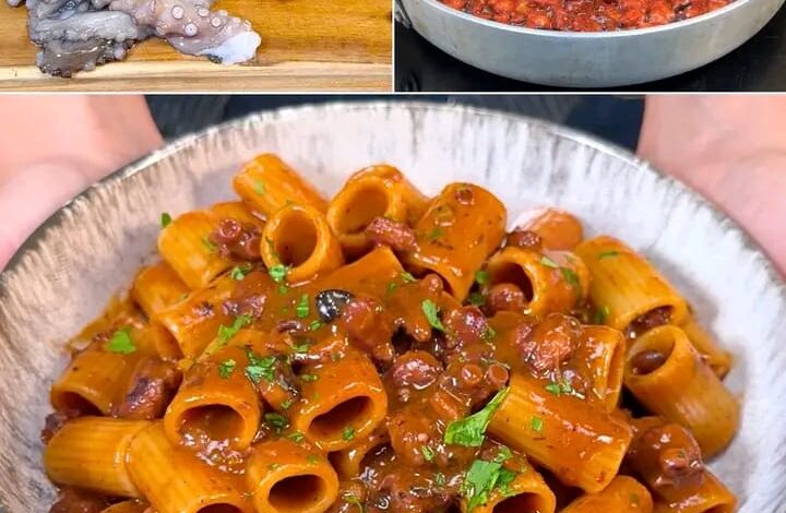 Servizio da Star: Servite subito in piatti fondi, guarnendo ogni porzione con un generoso cucchiaio di ragù extra e una spolverata di prezzemolo fresco tritato. Non aggiungete formaggio, il sapore del mare non lo richiede! [Immagine di X: Piatto di Rigatoni o Paccheri con il Ragù di Polpo pronto per essere gustato]